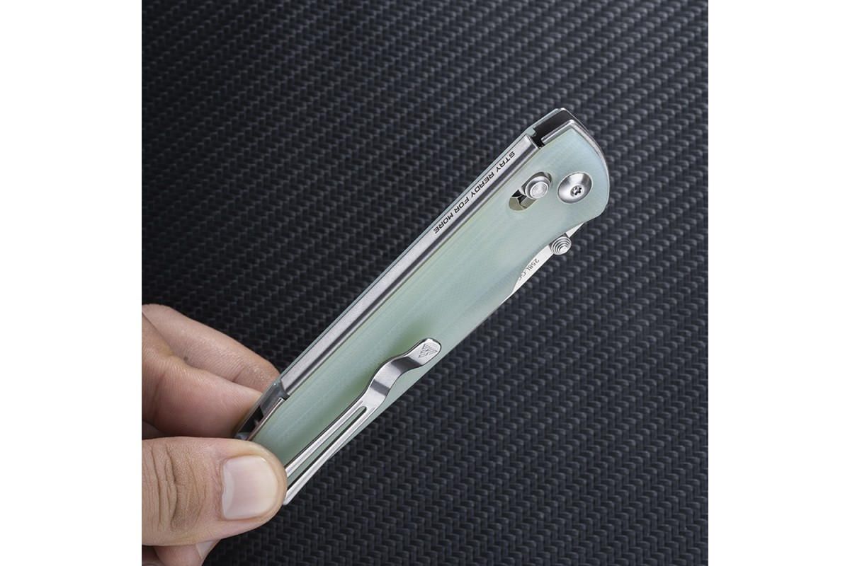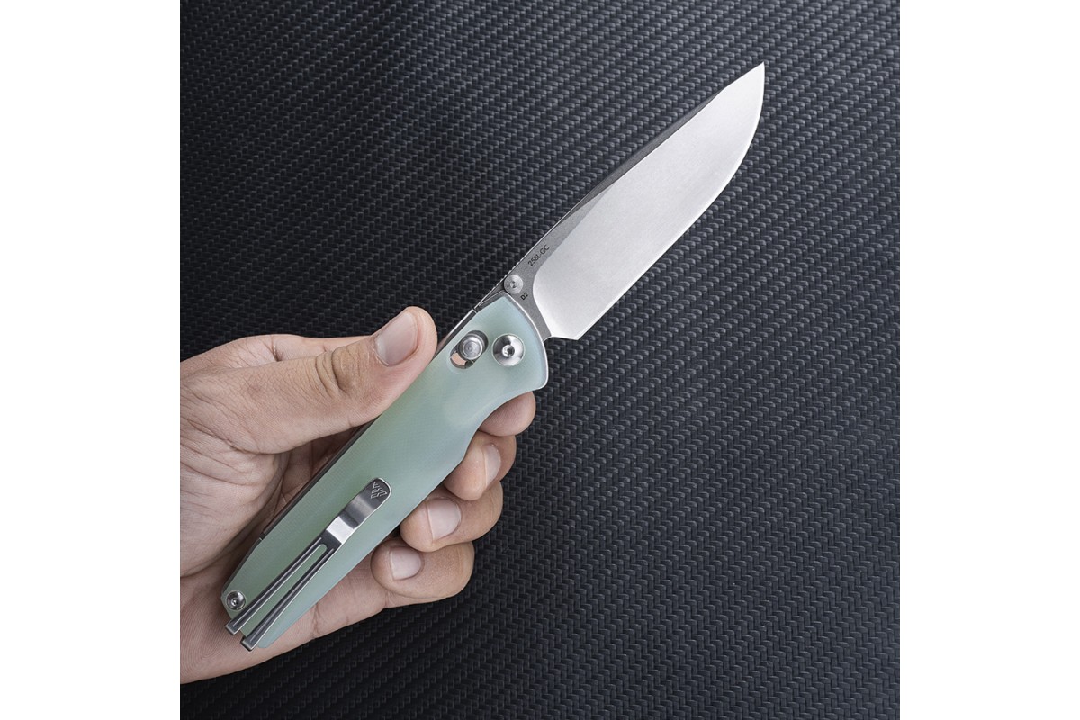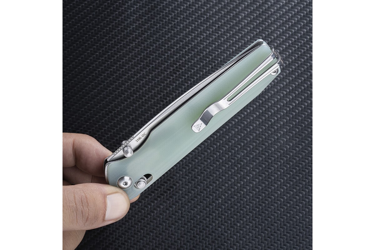 Рукоять выполнена из прочного и надежного стеклотекстолита G10, обладающего высокой устойчивостью к влаге и механическим повреждениям. В осевом узле установлен керамический подшипник, обеспечивающий мягкое, быстрое и точное открытие. Замок Ambi Lock, основанный на поперечном штифте, предотвращает самопроизвольное закрытие даже под высокой нагрузкой. Нож легко управляется одним пальцем, что выгодно отличает его от многих аналогов с менее удобной системой.