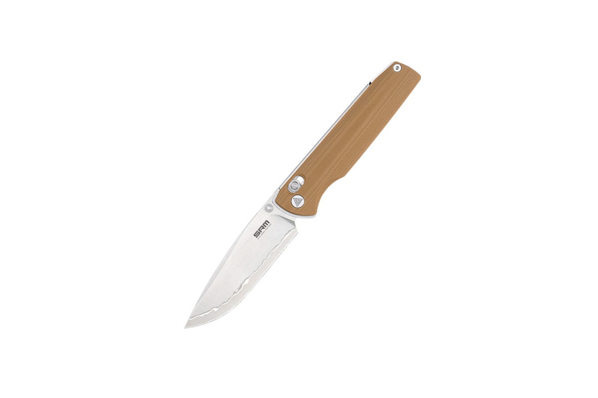 Общая длина складного ножа SRM Terrier — 205,4 мм, а вес — всего 100 г, что делает его лёгким и компактным для походов, туризма и повседневного ношения. Клинок изготовлен из стали 140Cr, благодаря ламинированию двумя слоями других нержавеющих сталей, лезвие обладает характеристиками, сравнимыми со сталью S35VN. Твердость 61–63 HRC обеспечивает длительное удержание заточки, что гарантирует отличную износостойкость и долговечность. Охлажденная заточка в свою очередь помогает сохранить оптимальные характеристики стали и делает режущую кромку более стойкой и острой. Финишная обработка клинка — пескоструйная, такой вид финиша хорошо скрывает царапины, отпечатки пальцев и не бликует, что особенно важно для охотников или работы на солнце.