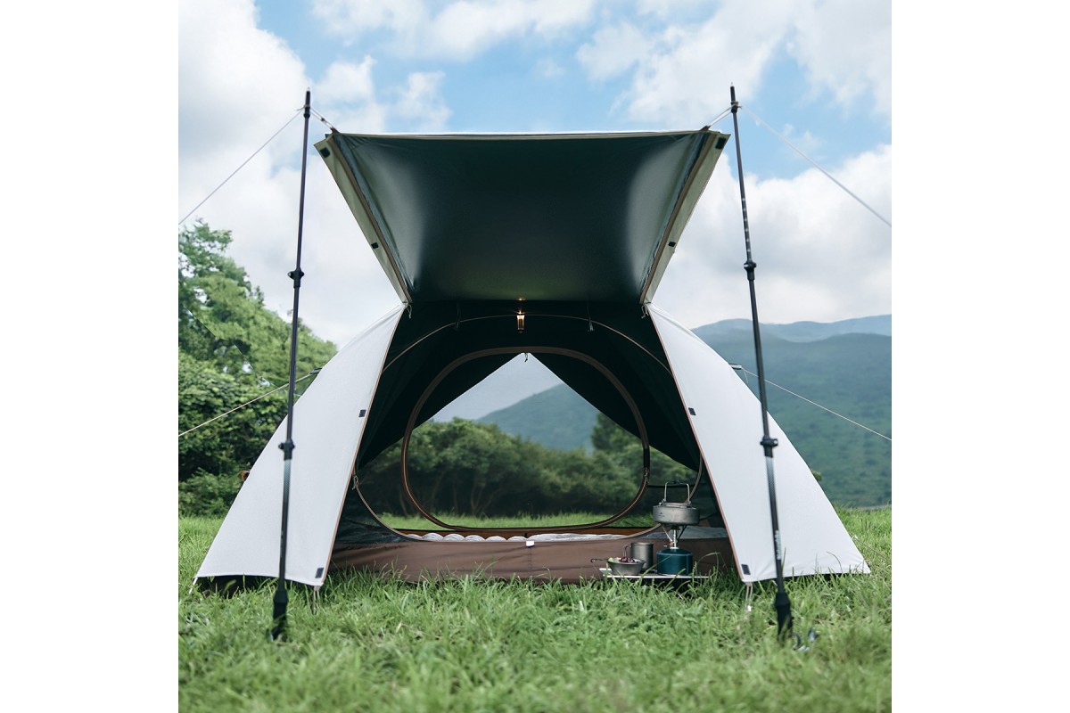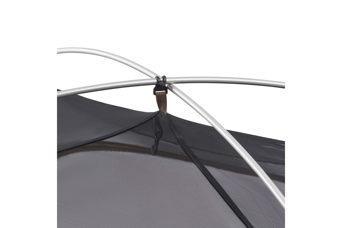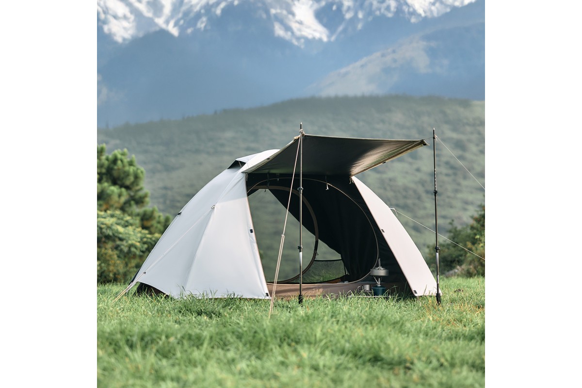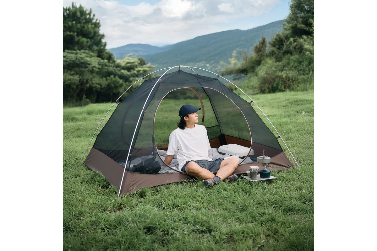 Каркас изготовлен из прочного алюминия. Крестообразная конструкция надежно держит форму, поэтому палатка не шатается даже в ветреную погоду. Чуть закругленные части каркаса увеличивают место в палатке, поднимая высоту потолка на несколько сантиметров. Двухслойный тент из полиэстера 210T надежно защищает от сквозняков и дождливой погоды. Сетчатый тент, который выступает в качестве подкладки и москитной сетки, можно использовать отдельно от верхнего слоя. В теплую погоду это позволит отдыхать под открытым небом и добавит особой атмосферы в путешествие.