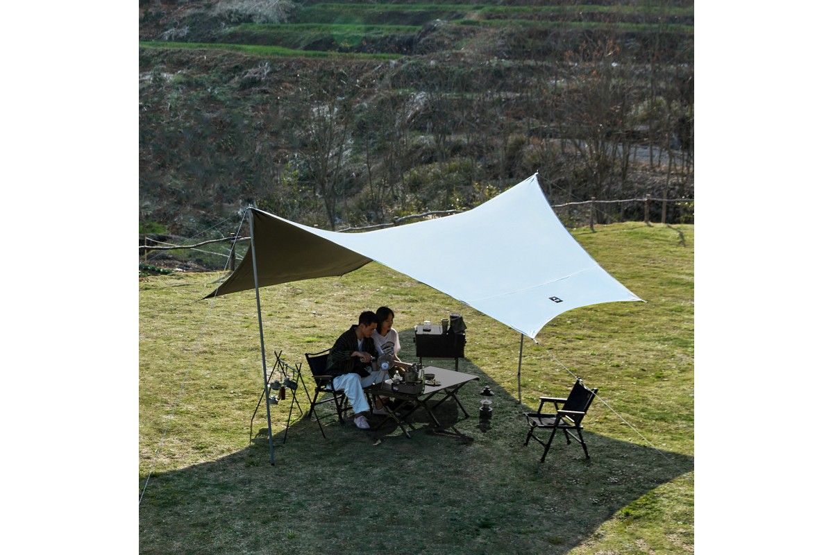 Метод установки простой: тент с двумя стойками быстро раскладывается с помощью оттяжек и колышков. После использования тент убирается в компактный чехол, который удобно хранить и перевозить.